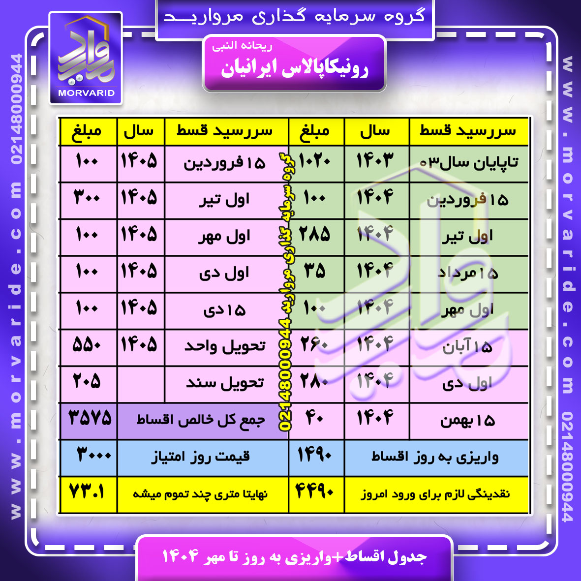 جدول اقساط + واریزی به روز + قیمت امتیاز رونیکاپالاس ایرانیان ریحانه النبی گروه سرمایه گذاری مروارید
