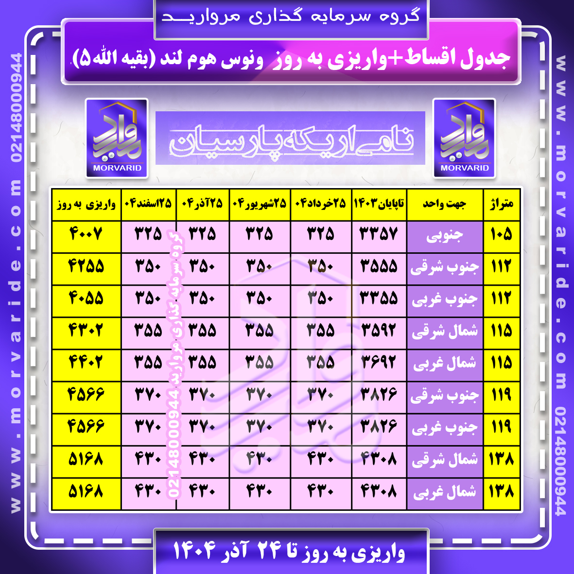 جدول اقساط بقیه الله 5 ونوس هوم لند تا 24 آذر 1404 گروه سرمایه گذاری مروارید